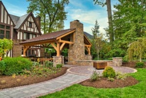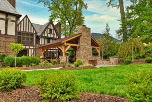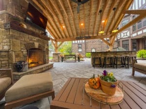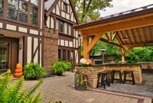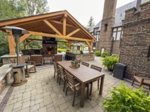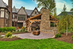Our team seamlessly married the craftsmanship of this Lakewood-based English Tudor to the design and build of the Old World-inspired outdoor living space. The large scale pavilion sits on a reconstituted patio utilizing original pavers from the home. We blended the stone with new pavers throughout the property, and into the circular seating area with fire-pit and circle inset, all while using different inlay methods. All masonry elements of the project use Old World veneer stone. These features include the pavilion wrapped columns, gas starter fireplace, and kitchen/grill station, which is topped with a 90 degree leathered granite counter-top for both cooking and entertaining. New landscaping and plant material were installed to soften the overall aesthetic.