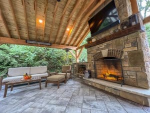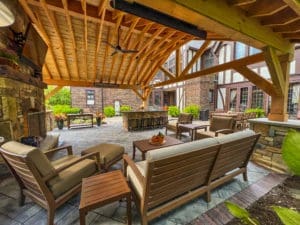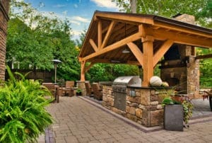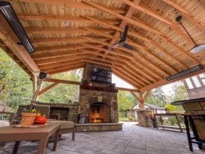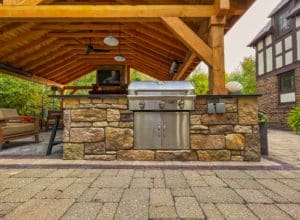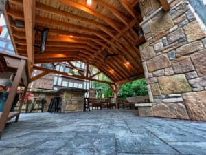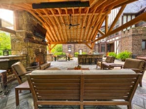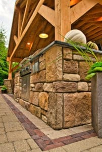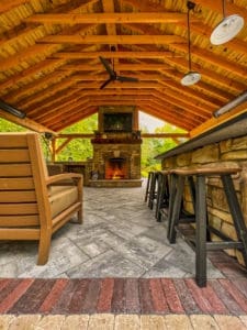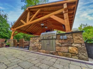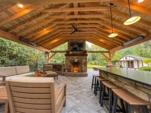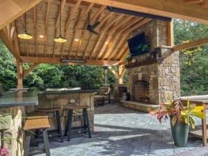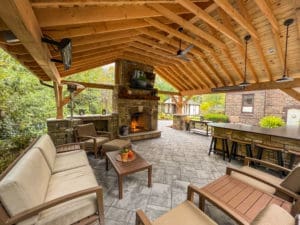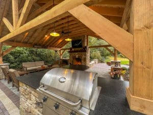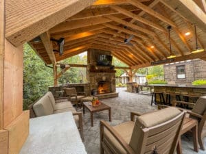 Under the metal roof of the A-frame pavilion there is a full living room and outdoor kitchen that includes a gas grill and extended 90-degree bar top made from leathered granite. We designed the backyard with the intention for it to be used during all four seasons. The timeless aesthetic ensures years of entertainment to come.